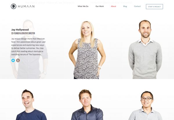 一個(gè)好故事并不需要做的太復(fù)雜。Humaan 就很直接的借助團(tuán)隊(duì)照片和懸浮動(dòng)效來講述故事,幫助訪客了解這個(gè)團(tuán)隊(duì)的成員。這種設(shè)計(jì)簡(jiǎn)單而有效。(注意懸浮狀態(tài)下每個(gè)成員姿勢(shì)和表情的變化,非常有意思)