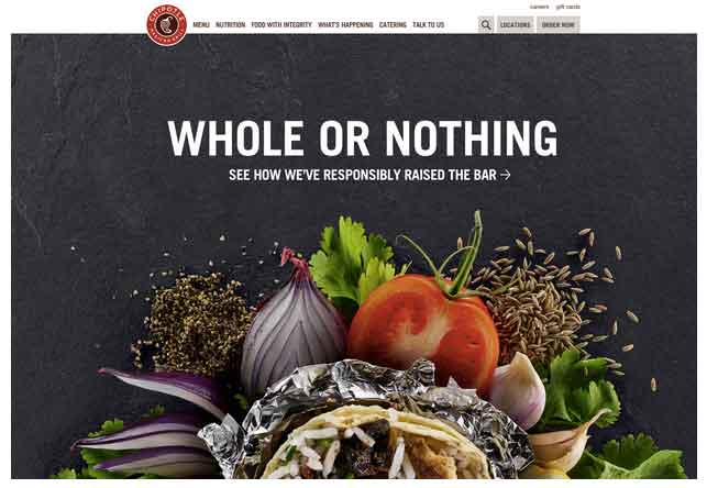 現在,網頁設計整體趨向于單頁網站設計。這種趨勢是由于對追求簡單和速度的推動。簡單的單頁網站也是一種很好的響應式設計,并且可以適應所有設備。當然,也有很多情況下需要用到多頁設計。比如,快餐網站Chipotle為了便于快速瀏覽菜單,使用的就是多頁面設計。
