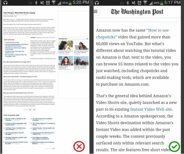 對于移動設備,您應該每行30- 40 個字符 。以下是在移動設備上查看的兩個網站的示例。第一個使用每行50- 75 個字符(打印和桌面的每行最佳字符數),而第二個使用最佳30- 40 個字符。