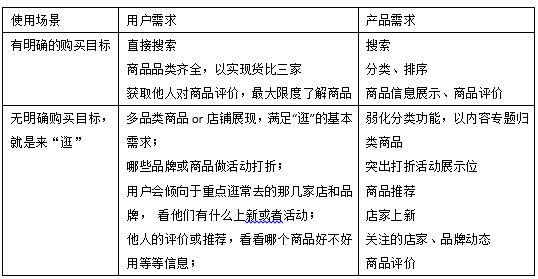 ① 大多數(shù)電商消費(fèi)者的使用場(chǎng)景可分成兩大類,如下表: