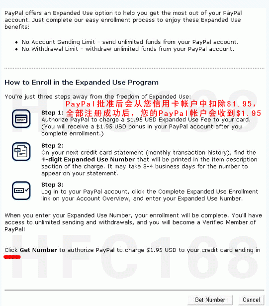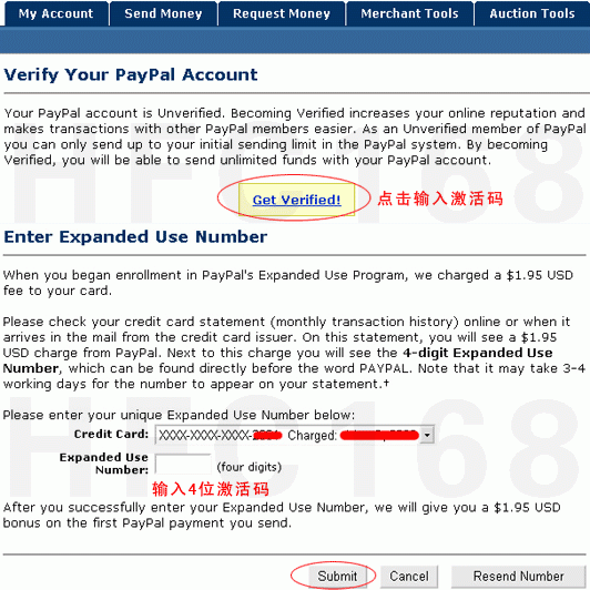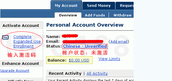 上www.paypal.com登錄后,點(diǎn)左邊的”Complete Expanded Use Enrollment” ,然后點(diǎn)”Get verified” 來(lái)輸入驗(yàn)證(激活)碼并提交。