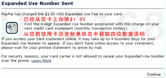 等待大約四個(gè)工作日,到你用國(guó)際信用卡開(kāi)通的網(wǎng)上銀行(或致電到您的國(guó)際信用卡銀行)去獲取激活碼。此時(shí)登入網(wǎng)上銀行去查詢會(huì)發(fā)現(xiàn)扣了1.95美元,將來(lái)會(huì)返回到你的PayPal上。