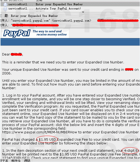 收取Paypal發(fā)來(lái)的郵件,表示已經(jīng)從您的銀行信用卡帳戶中扣除$1.95 USD