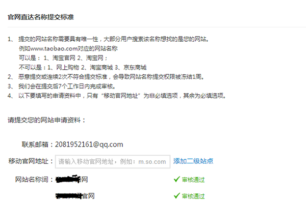 你可以提交2個關鍵詞,但提交的2個網站關鍵詞必須是唯一性,得證明大部分用戶搜索該名稱想找的就是您的網站,這樣成功幾率才大。剛做好的新站,不建議立即做官網認證,因為你的品牌還沒傳播開來,沒多少人去搜,最好優化推廣一段時間再去申請,否則肯定這一步就會被卡在。