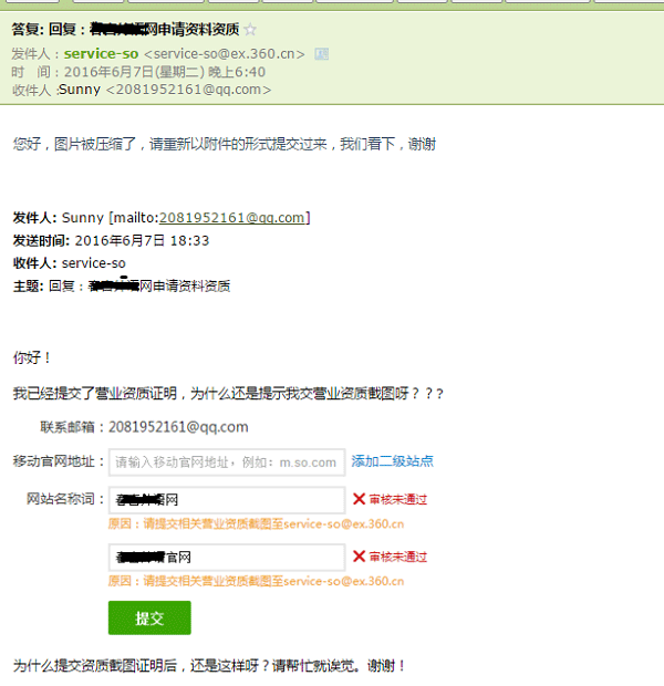 信息填好后還沒完,一定要通過郵件遞交“營業執照”蓋章復印件,最好還加個工信部的截圖,截圖不能太大,最好以附件的形式發,發到service-so@ex.360.cn郵箱,工作人員會審核,一般效率會比較高,我的是3天就過了。你可以隨時查看“官網認證”后臺,如果審核通過了,會看到“審核通過”字樣。