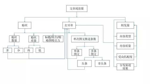 比如我們以公眾號運營為例,公眾號運營的關鍵指標是粉絲數和文章閱讀量,而粉絲數和文章閱讀量的影響緯度肯有很多個。這些緯度之間也存在相應的影響關系,具體如下: