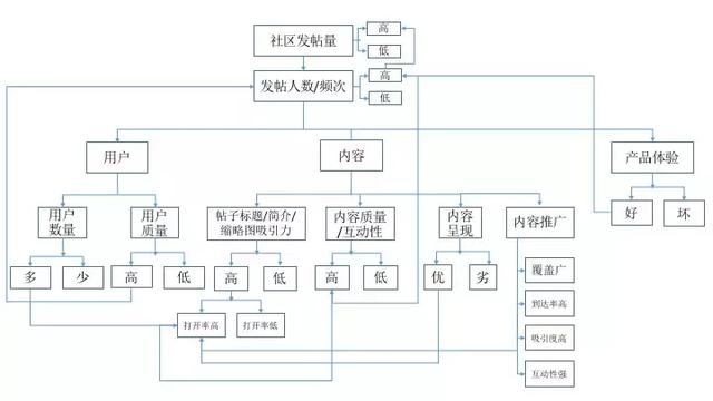 社區發帖量這一核心數據指標提升,是與整個社區的用戶量,用戶層級比例,用戶層級轉化,每個層級用戶行為,用戶粘性,社區內容質量,內容展示與推送情況等都存在一定的相關關系。所以,在社區的運營過程中就要不斷的促進各個影響維度與社區發帖量的正向關系。