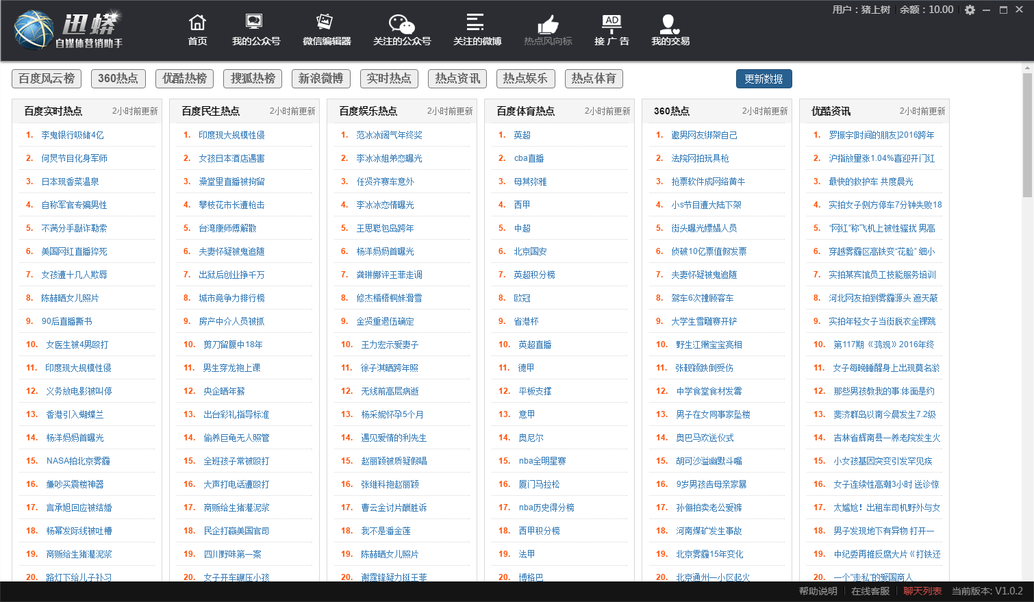 留住了粉絲才能有更多的賺錢的可能,可以推薦一款簡單好用的自媒體助手——迅蟒自媒體助手。可以幫助各位公眾號主,做好日常公眾號的運營。豐富的素材和方便的編輯器,可以幫助你更好地編輯文章,微信微博關注,實時熱點關注,可以給你每天的文章寫作提供素材。還可以同時登陸多個公眾號,同時管理多個公眾號,可以給多個公眾號同步素材。更重要的是公眾號主還可以通過軟件進行廣告交易,管理賺錢兩不耽誤。