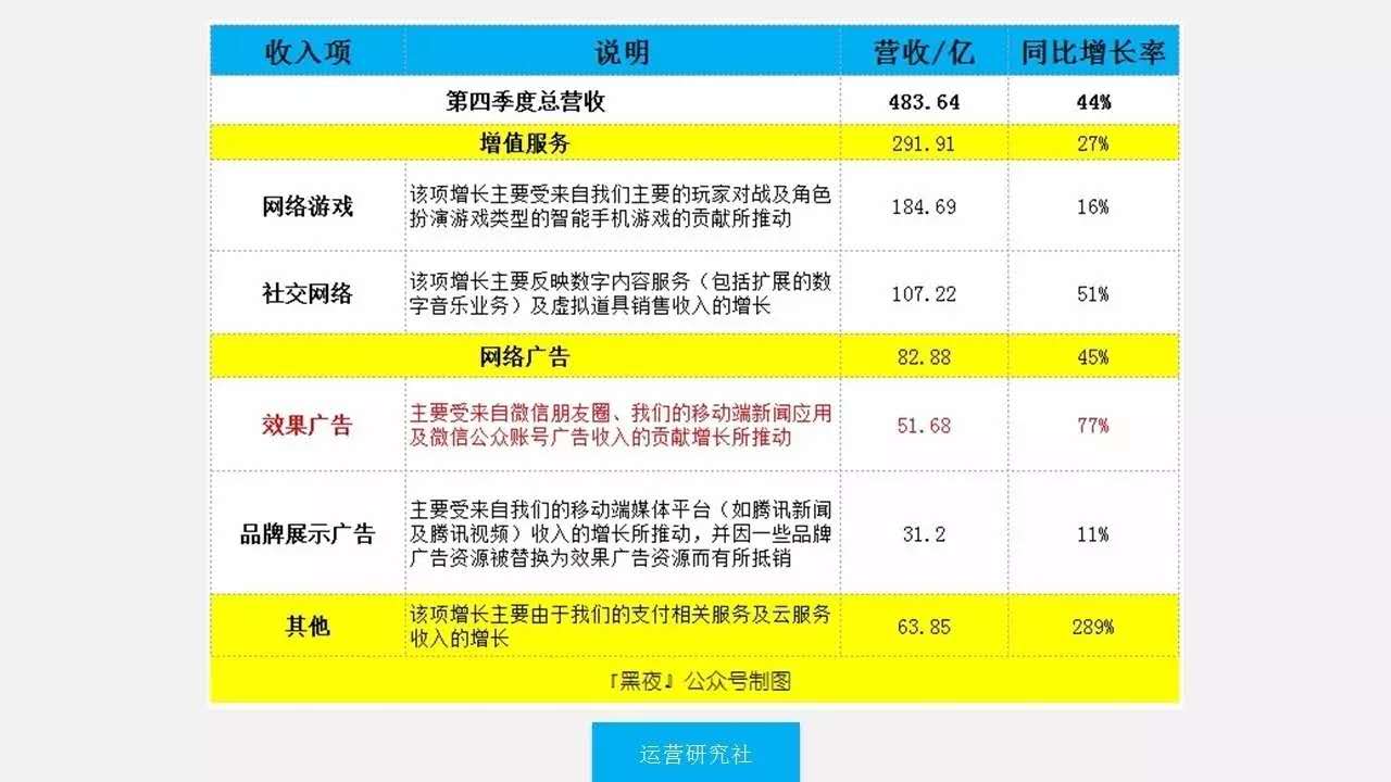 這是騰訊2016年第四季度的財(cái)報(bào),其中以微信為主要載體的效果廣告營收51.68億,占騰訊整個(gè)廣告營收的62.3%,同比增長率達(dá)到驚人的77%。相比百度第四季度的網(wǎng)絡(luò)營銷營收161.66億。說明微信廣告開始爆發(fā)并有著巨大增長空間。