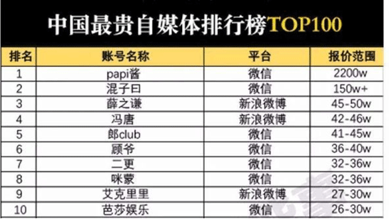 下圖是一份自媒體廣告報(bào)價(jià)表,可以看出,榜單前十名有七名都源自微信公眾號(hào)這個(gè)平臺(tái),其中第一名是今年炙手可熱的新星PAPI醬,微信公眾號(hào)廣告的報(bào)價(jià)達(dá)到了2200萬元,在榜單上遙遙領(lǐng)先。