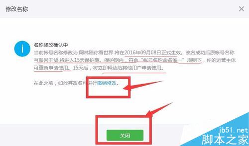 當(dāng)我們修改好了,這時(shí)候就會(huì)出現(xiàn)下面的說明,名稱有一個(gè)15天的保護(hù)期和贖回期,而且我們還能撤銷修改!