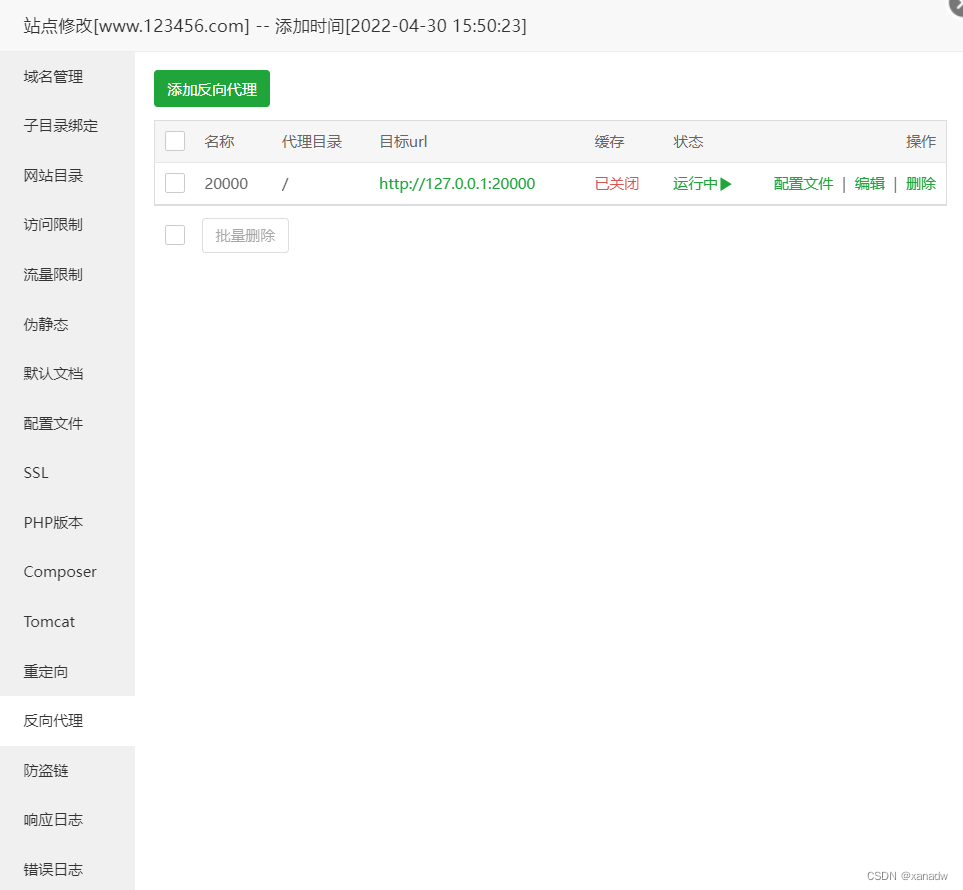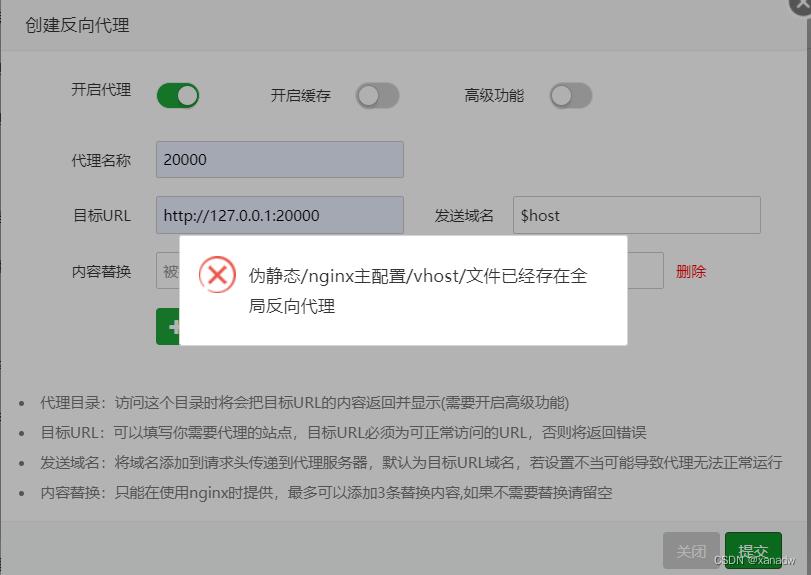 阿里云搭建的寶塔Linux面板,上面已經搭建過其它網站了,我現在給一個新增的網站增加一個反向代理端口,但是通過寶塔面板添加反向代理的時候,出現了下圖偽靜態的錯誤。
