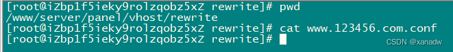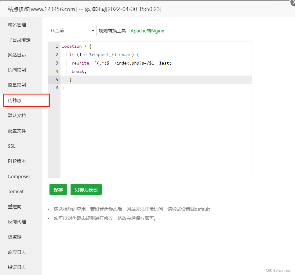server{ listen 80; server_name www.123456.com; index index.php index.html index.htm default.php default.htm default.html; root /www/wwwroot/www.123456.com; #SSL-START SSL相關配置,請勿刪除或修改下一行帶注釋的404規則 #error_page 404/404.html; #SSL-END #ERROR-PAGE-START 錯誤頁配置,可以注釋、刪除或修改 #error_page 404 /404.html; #error_page 502 /502.html; #ERROR-PAGE-END #PHP-INFO-START PHP引用配置,可以注釋或修改 include enable-php-74.conf; #PHP-INFO-END #REWRITE-START URL重寫規則引用,修改后將導致面板設置的偽靜態規則失效 include /www/server/panel/vhost/rewrite/www.123456.com.conf; #REWRITE-END #禁止訪問的文件或目錄 location ~ ^/(\.user.ini|\.htaccess|\.git|\.svn|\.project|LICENSE|README.md) {return 404; } #一鍵申請SSL證書驗證目錄相關設置 location ~ \.well-known{allow all; } location ~ .*\.(gif|jpg|jpeg|png|bmp|swf)$ {expires 30d;error_log /dev/null;access_log /dev/null; } location ~ .*\.(js|css)?$ {expires 12h;error_log /dev/null;access_log /dev/null; } access_log /www/wwwlogs/www.123456.com.log; error_log /www/wwwlogs/www.123456.com.error.log;}可以看到我這個配置頁面并沒有出現單獨的location /規則,都是加入了相關的后綴限制。但是可以看到上面還出現了一個 include /www/server/panel/vhost/rewrite/www.123456.com.conf 重寫的規則配置文件。