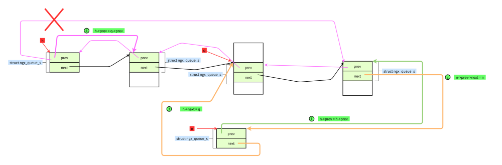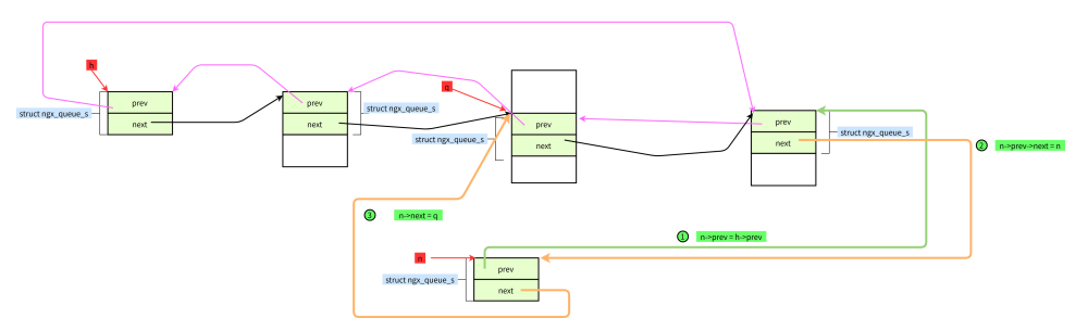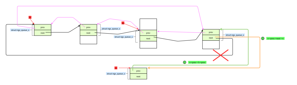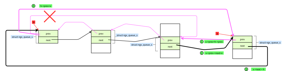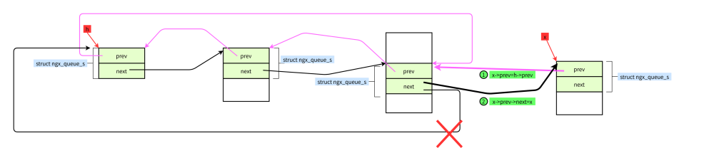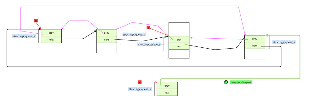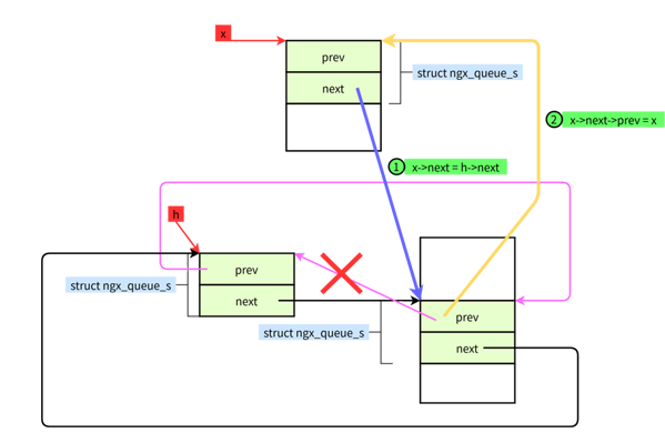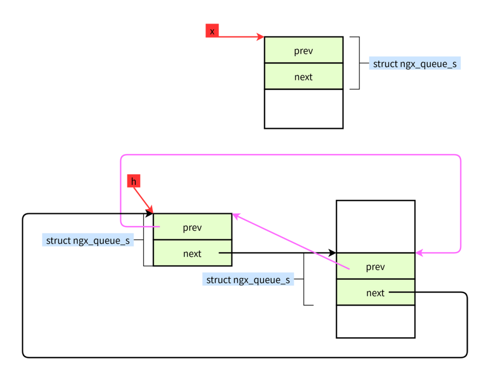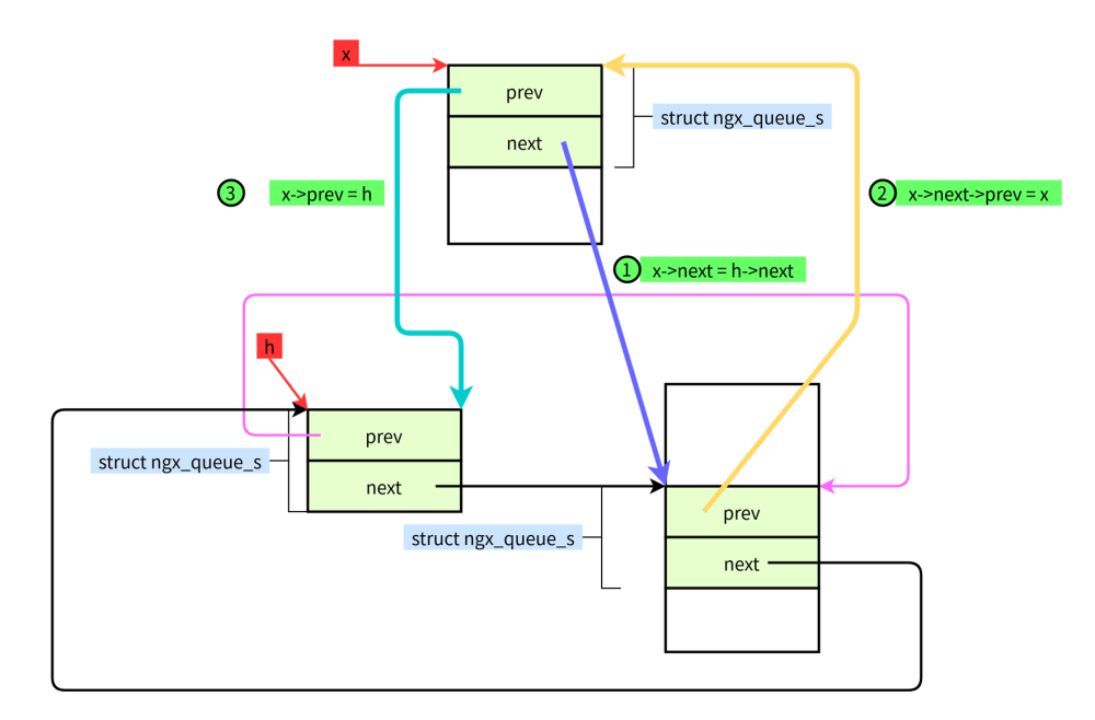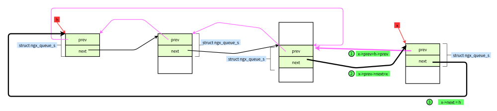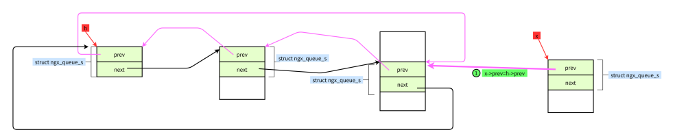 #define ngx_queue_insert_tail(h, x) \ (x)->prev = (h)->prev;\ (x)->prev->next = x; \ (x)->next = h;\ (h)->prev = x