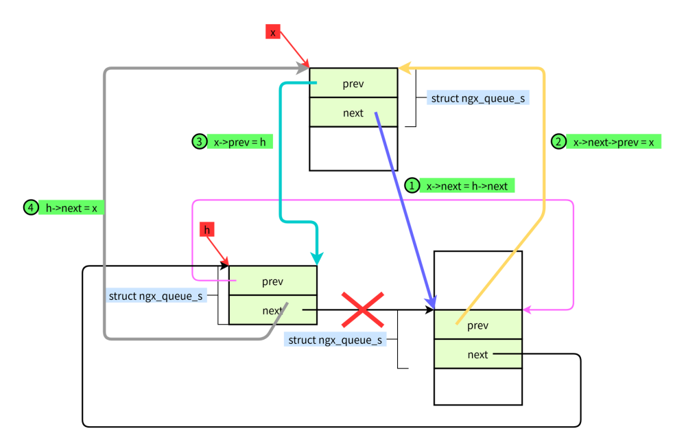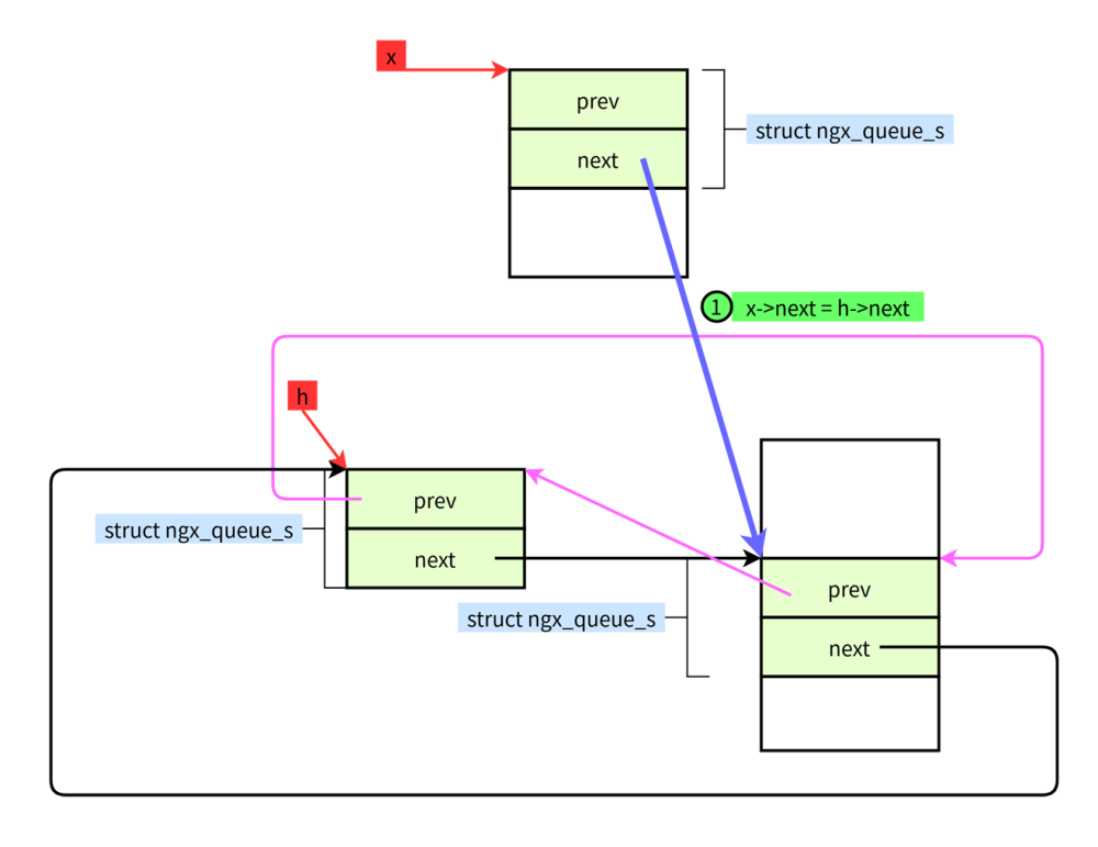 #define ngx_queue_insert_head(h, x) \ (x)->next = (h)->next;\ (x)->next->prev = x; \ (x)->prev = h;\ (h)->next = x