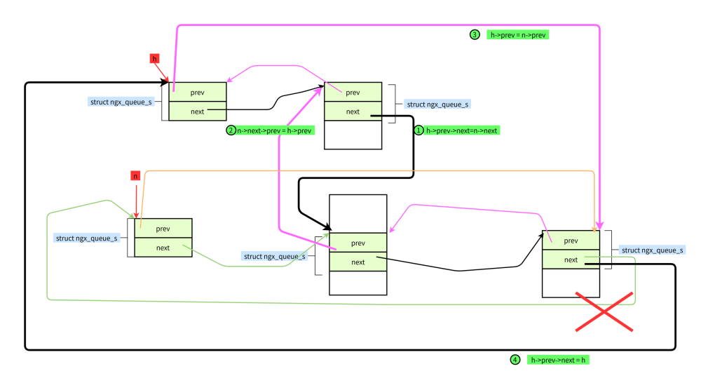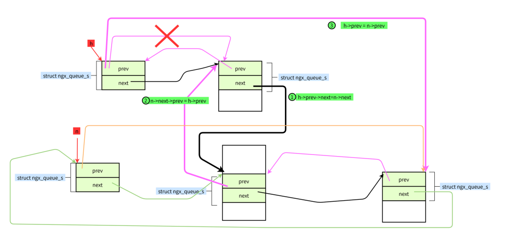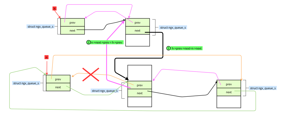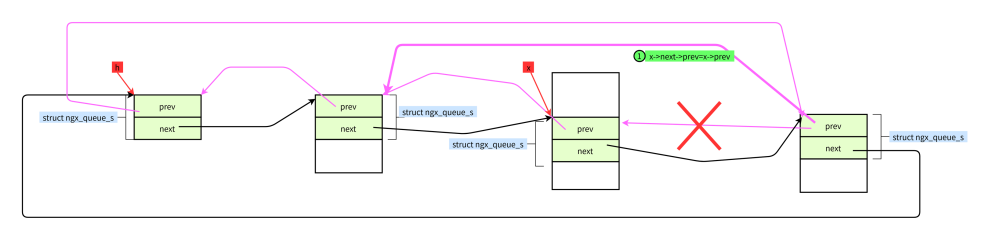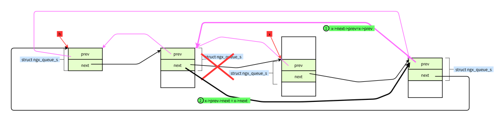 #define ngx_queue_remove(x) \ (x)->next->prev = (x)->prev; \ (x)->prev->next = (x)->next