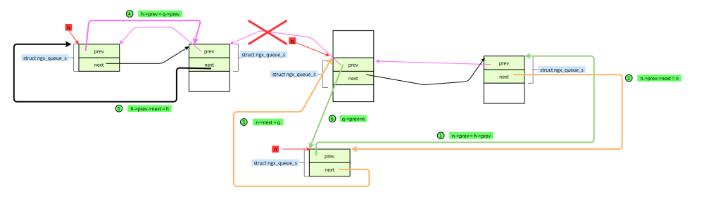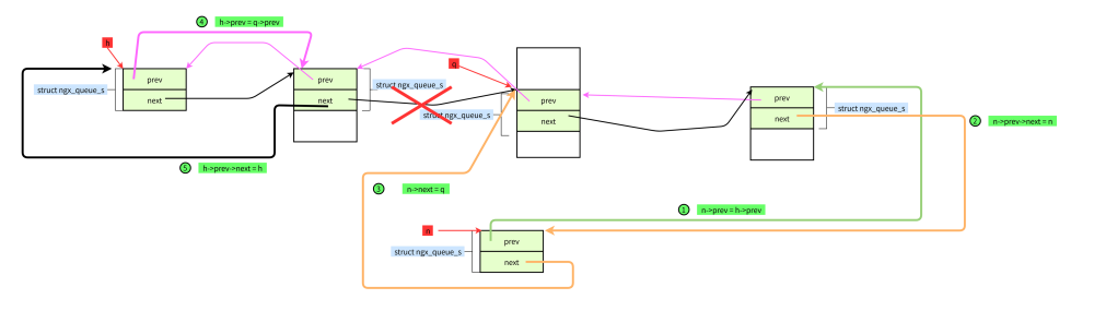 #define ngx_queue_add(h, n) \ (h)->prev->next = (n)->next; \ (n)->next->prev = (h)->prev; \ (h)->prev = (n)->prev;\ (h)->prev->next = h;