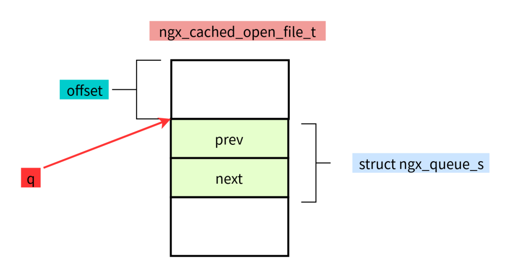 q的地址減去offset獲取到ngx_cached_open_file_t的地址,然后在強轉為對應的類型。