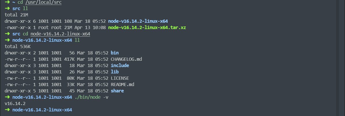 cd /usr/local/src/tar xf node-v16.14.2-linux-x64.tar.xzcd node-v16.14.2-linux-x64/./bin/node -v