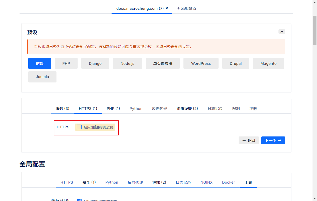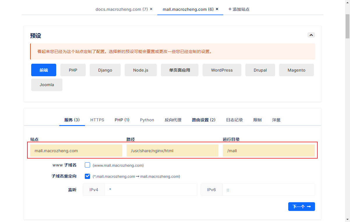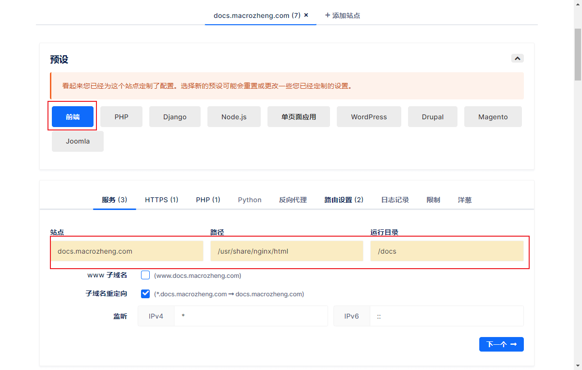 在NginxConfig中選擇好預設為前端,然后修改服務配置,配置好站點、路徑和運行目錄;