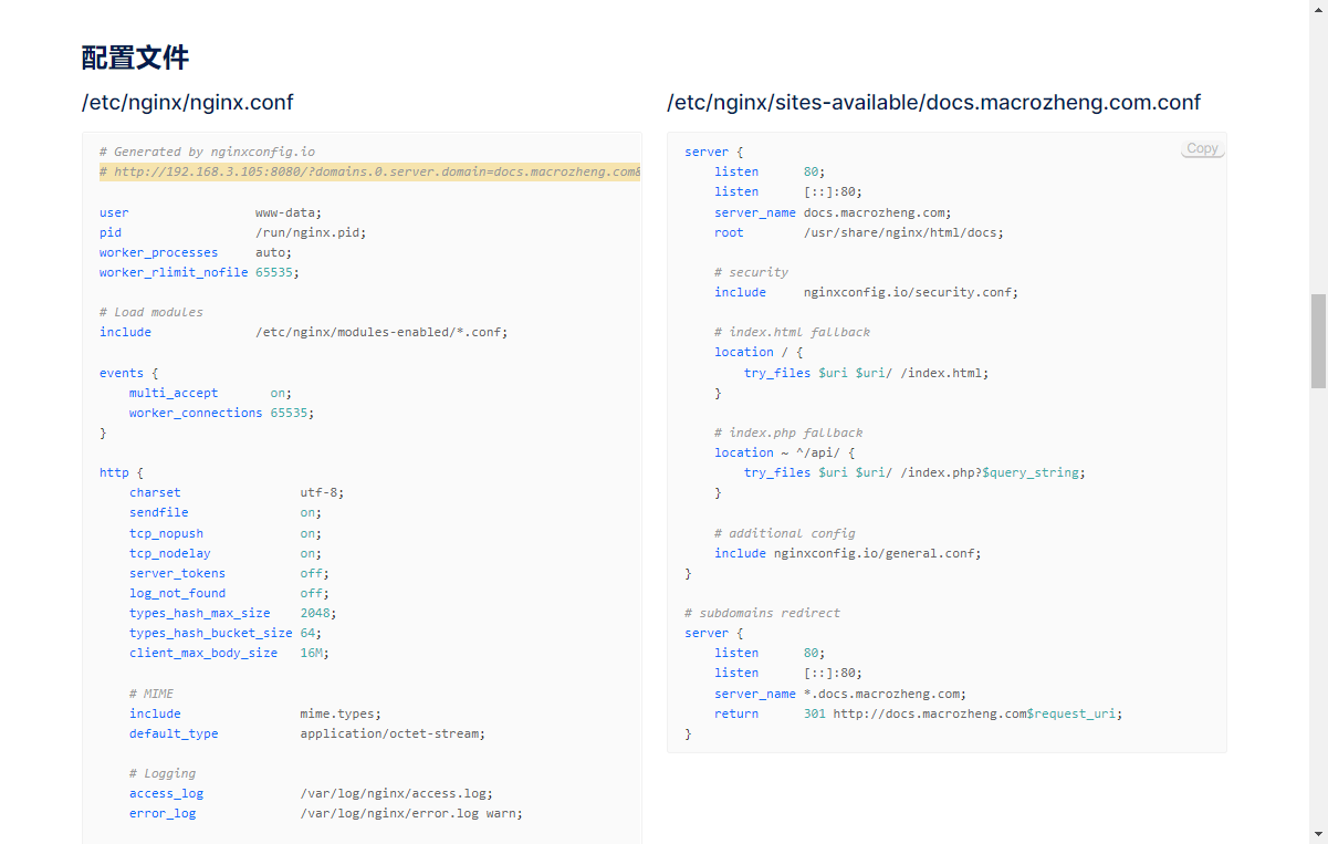 使用配置 接下來我們就可以直接下載NginxConfig給我們生成好的配置了;