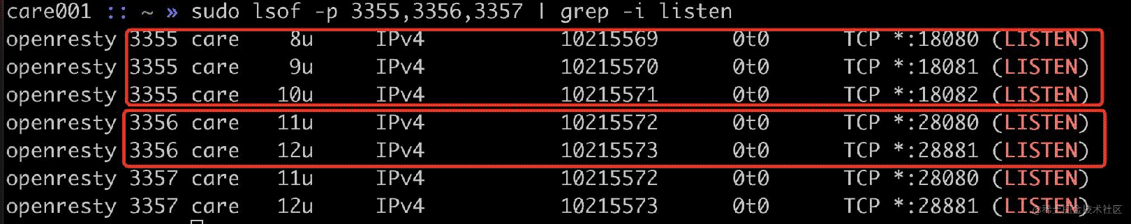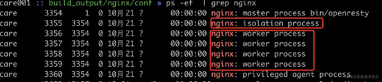 init_by_lua_block { local process = require "ngx.process" local ports = {18080, 18081, 18083} local ok, err = process.enable_isolation_process(ports) if not ok then ngx.log(ngx.ERR, "enable enable_isolation_process failed") return else ngx.log(ngx.ERR, "enable enable_isolation_process success") end}這里需要 lua 通過 ffi 傳入到 OpenResty 中,這里不是本文的重點,就不展開講述。