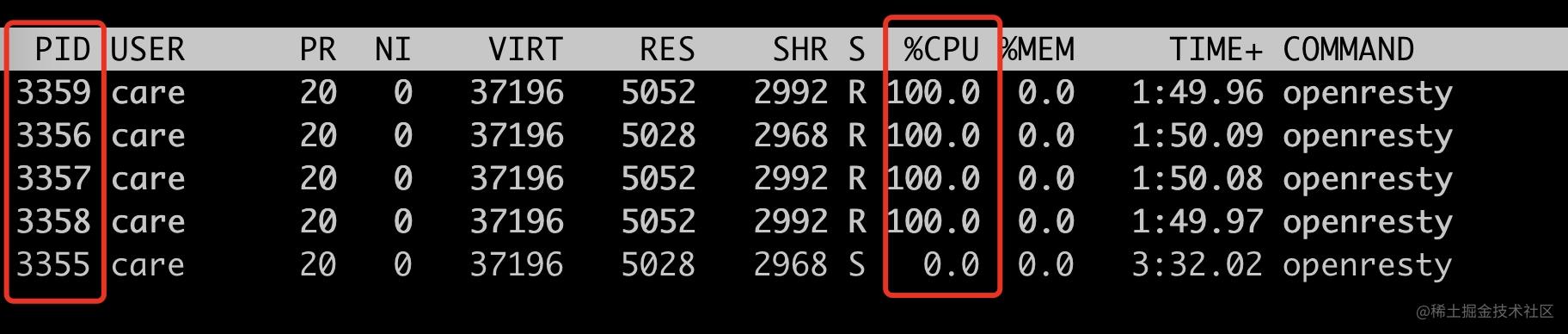 符合預期,只會跑滿 4 個普通 worker 進程(pid=3356~3359),此時 3355 的 cpu 使用率為 0。