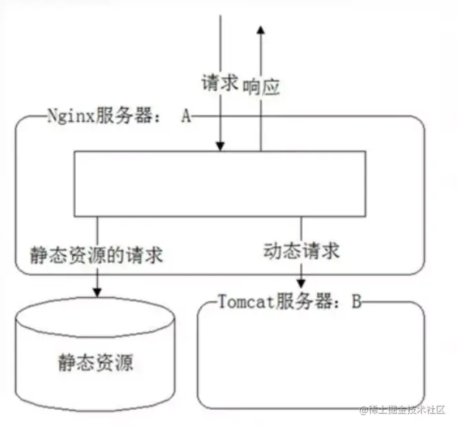 服務(wù)端接收來自客戶端的請求中,既有靜態(tài)資源也有動態(tài)資源,靜態(tài)資源由 Nginx 提供服務(wù),動態(tài)資源由 Nginx 轉(zhuǎn)發(fā)至后端。