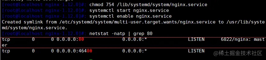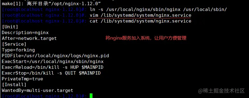 make && make installln -s /usr/local/nginx/sbin/nginx /usr/local/sbin/vim /lib/systemd/system/nginx.service[Unit]Description=nginxAfter=network.target[Service]Type=forkingPIDFile=/usr/local/nginx/logs/nginx.pidExecStart=/usr/local/nginx/sbin/nginxExecrReload=/bin/kill -s HUP $MAINPIDExecrStop=/bin/kill -s QUIT $MAINPIDPrivateTmp=true[Install]WantedBy=multi-user.targetchmod 754 /lib/systemd/system/nginx.servicesystemctl start nginx.servicesystemctl enable nginx.service