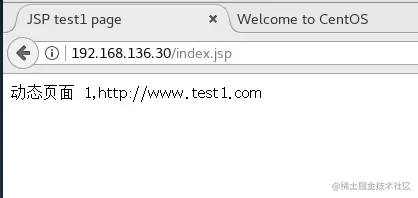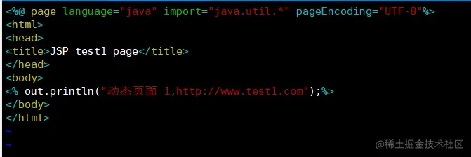 mkdir /usr/local/tomcat/webapps/testvim /usr/local/tomcat/webapps/test/index.jsp<%@ page language="java" import="java.util.*" pageEncoding="UTF-8"%><html><head><title>JSP test1 page</title> #指定為 test1 頁面</head><body><% out.println("動態(tài)頁面 1,http://www.test1.com");%></body></html>vim /usr/local/tomcat/conf/server.xml#由于主機名 name 配置都為 localhost,需要刪除前面的 HOST 配置<Host name="localhost" appBase="webapps" unpackWARs="true" autoDeploy="true" xmlValidation="false" xmlNamespaceAware="false"> <Context docBase="/usr/local/tomcat/webapps/test" path="" reloadable="true"> </Context></Host>/usr/local/tomcat/bin/shutdown.sh /usr/local/tomcat/bin/startup.sh