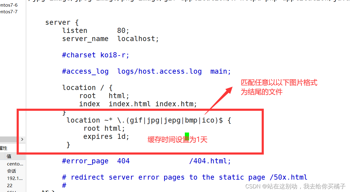 vim /usr/local/nginx/conf/nginx.confhttp {................. location ~* \.(gif|jpg|jepg|bmp|ico)$ { root html; expires 1d; }}