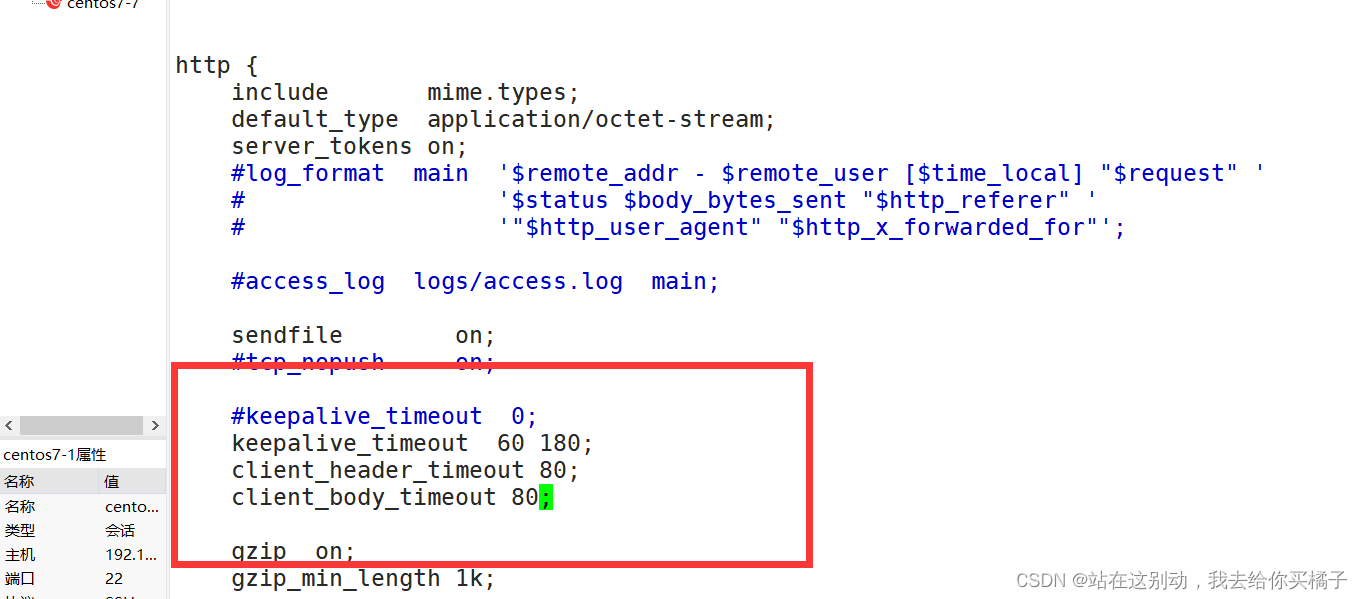 vim /usr/local/nginx/conf/nginx.conf http { ...... keepalive_timeout 65 180; //設(shè)置連接超時(shí)時(shí)間 client_header_timeout 80; client_body_timeout 80; ...... }- 指定KeepAlive的超時(shí)時(shí)間(timeout) 。指定每個(gè)TCP連接最多可以保持多長(zhǎng)時(shí)間,服務(wù)器將會(huì)在這個(gè)時(shí)間后關(guān)閉連接。