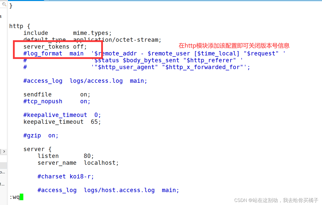 vim /usr/local/nginx/conf/nginx.conf http { include mime.types; default_type application/octet-stream; server_tokens off; #添加這一行,關(guān)閉版本號(hào) ...... }