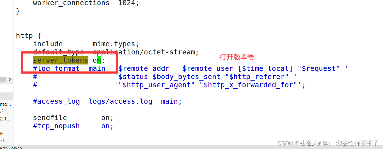 vim /usr/local/nginx/conf/nginx.conf http { include mime.types; default_type application/octet-stream; server_tokens on; ...... }