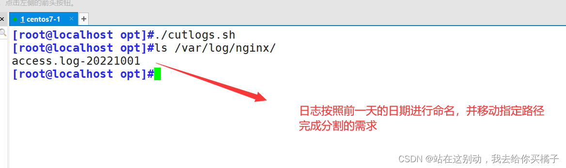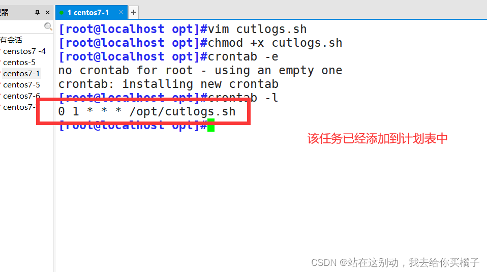 [root@localhost opt]#vim cutlogs.sh[root@localhost opt]#chmod +x cutlogs.sh [root@localhost opt]#crontab -e0 1 * * * /opt/cutlogs.sh