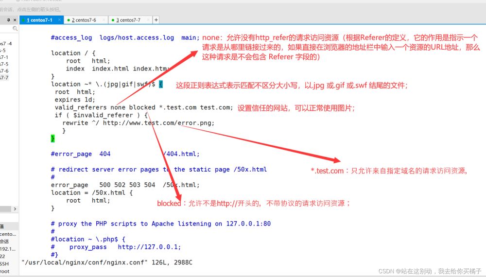 vim /usr/local/nginx/conf/nginx.confhttp {...........server{...........location ~* \.(jpg|gif|swf)$ { root html; expires 1d; valid_referers none blocked *.test.com test.com; if ( $invalid_referer ) { rewrite ^/ http://www.test.com/error.png; }}............}...............}