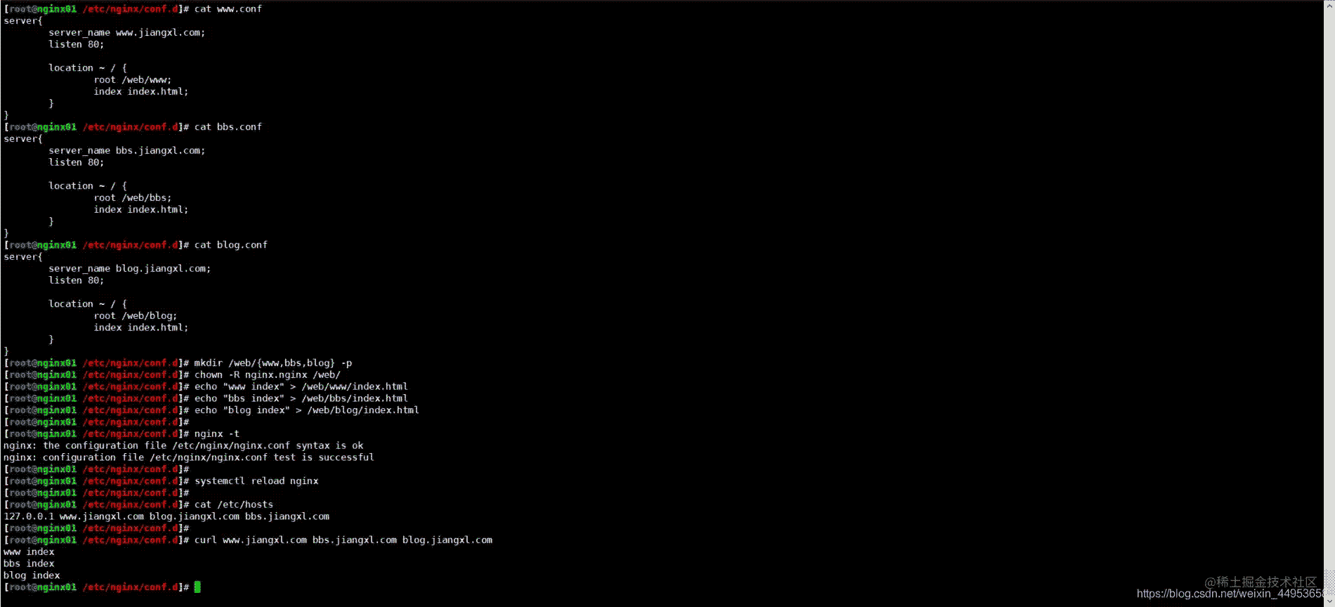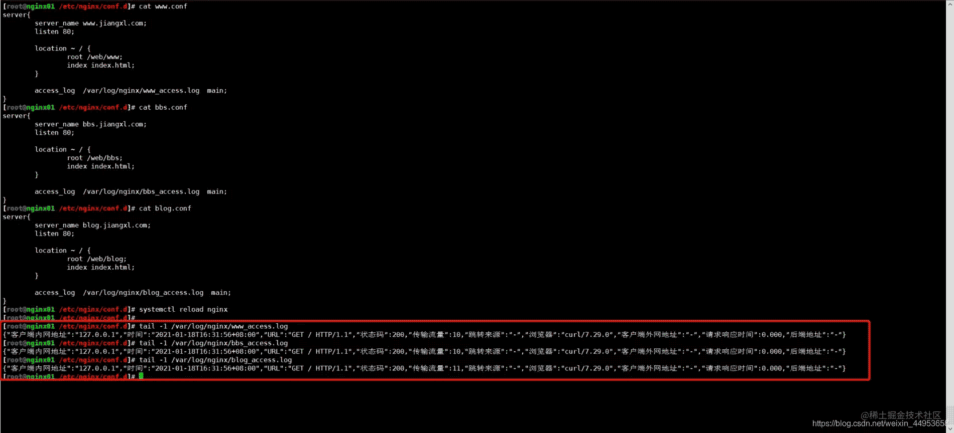 cat www.conf server{ server_name www.jiangxl.com; listen 80; location ~ / { root /web/www; index index.html; } access_log /var/log/nginx/www_access.log main;}cat bbs.conf server{ server_name bbs.jiangxl.com; listen 80; location ~ / { root /web/bbs; index index.html; } access_log /var/log/nginx/bbs_access.log main;}cat blog.conf server{ server_name blog.jiangxl.com; listen 80; location ~ / { root /web/blog; index index.html; } access_log /var/log/nginx/blog_access.log main;}