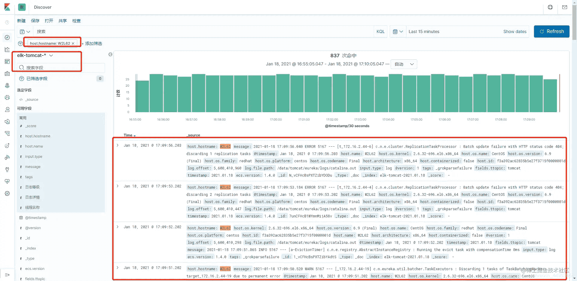 如下圖所示,tomcat就是聚合收集,查哪臺機器的日志就添加一個篩選寫上主機名就可以了