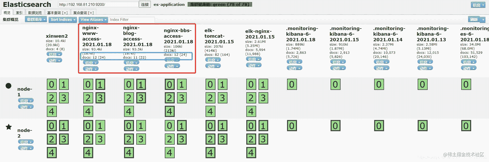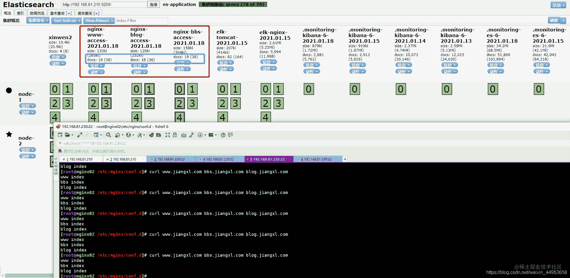 由于nginx集群相同的應用是要寫在同一個索引庫中的,因此我們要觀察每加一個集群產(chǎn)生的數(shù)據(jù)變化