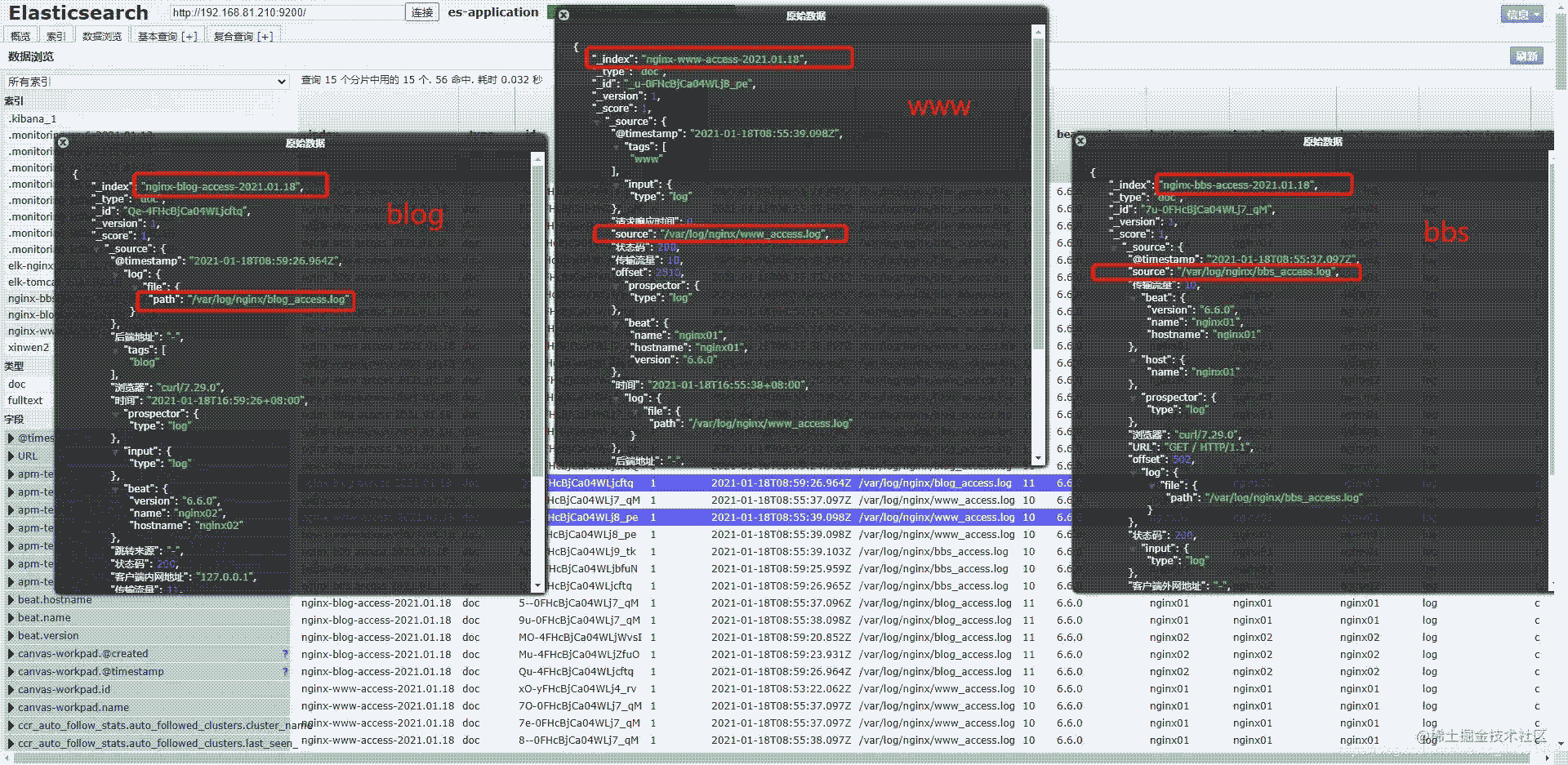那么日志也一樣的,我們可以把www_access.log當成是一個標記,當標記內(nèi)容為www_access.log時,我們就把他的日志存儲在www_access_xxx的索引庫中