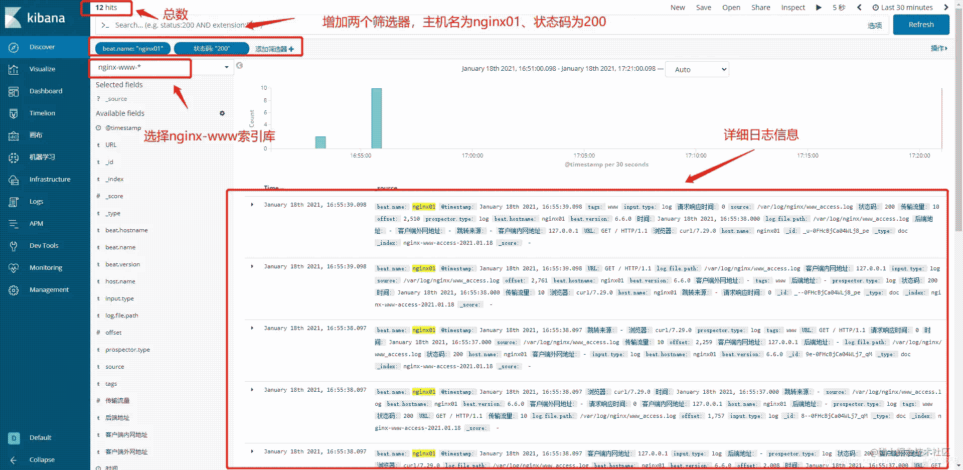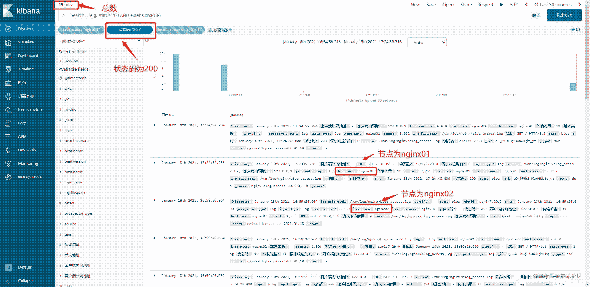 篩選添加:beat.name(主機名)is(是) nginx01(主機名)