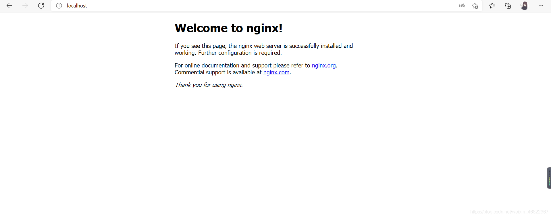 3、啟動Nginx,進入localhost 界面如下圖所示說明啟動成功,默認端口號:80