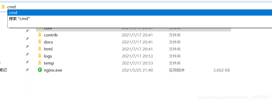 6、修改完配置后,在nginx當前目錄上輸入cmd,進入控制臺,輸入如下命令。
