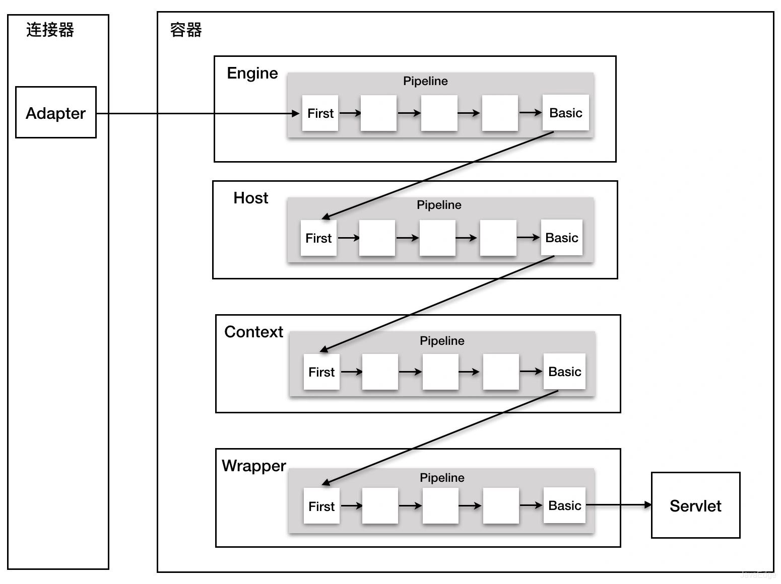 每個容器都有一個Pipeline對象,只要觸發(fā)這個Pipeline的第一個Valve,這個容器里Pipeline中的Valve就都會被調(diào)用到。但不同容器的Pipeline如何鏈?zhǔn)接|發(fā)?