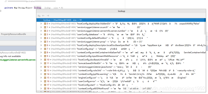 最終發現所有的值存在了PropertyResourceBundle類的lookup的map集合中,集合中的數據已經亂碼了。