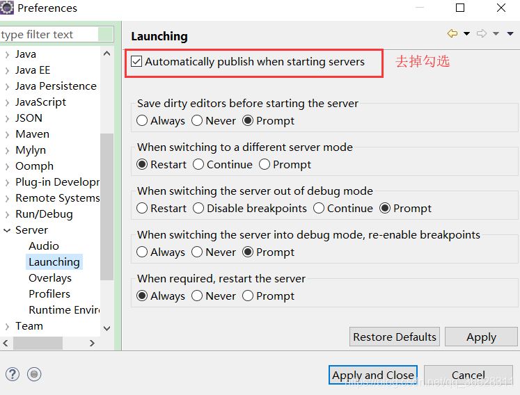 依次選擇 Window-Preferences-Server-Launching,取消勾選Automatically publish wen starting servers,點擊OK。