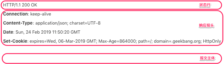 HTTP 的響應也是由三部分組成,分別是狀態(tài)行、響應報頭、報文主體。同樣,我還以極客時間登陸請求的響應為例。