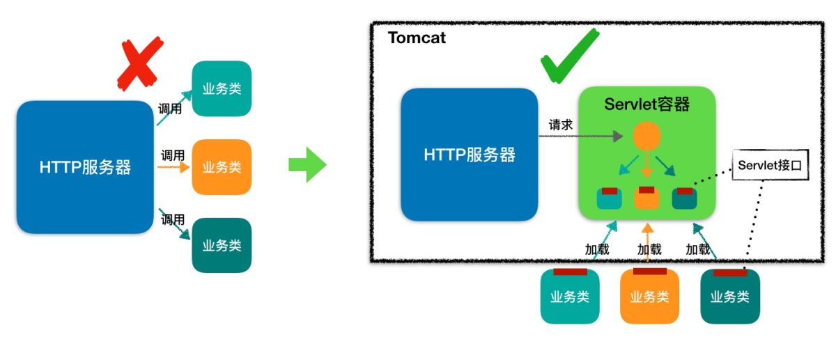 那該怎么解決這個問題呢?我們知道,面向接口編程是解決耦合問題的法寶,于是有一伙人就定義了一個接口,各種業(yè)務類都必須實現(xiàn)這個接口,這個接口就叫 Servlet 接口,有時我們也把實現(xiàn)了 Servlet 接口的業(yè)務類叫作 Servlet。