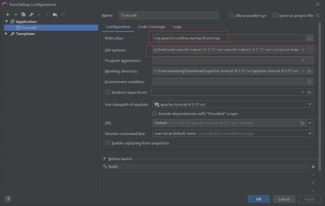 MainClass: org.apache.catalina.startup.BootstrapVmOptions: -Dcatalina.home=C:\Users\wukong\Downloads\apache-tomcat-8.5.57-src\apache-tomcat-8.5.57-src\catalina-home