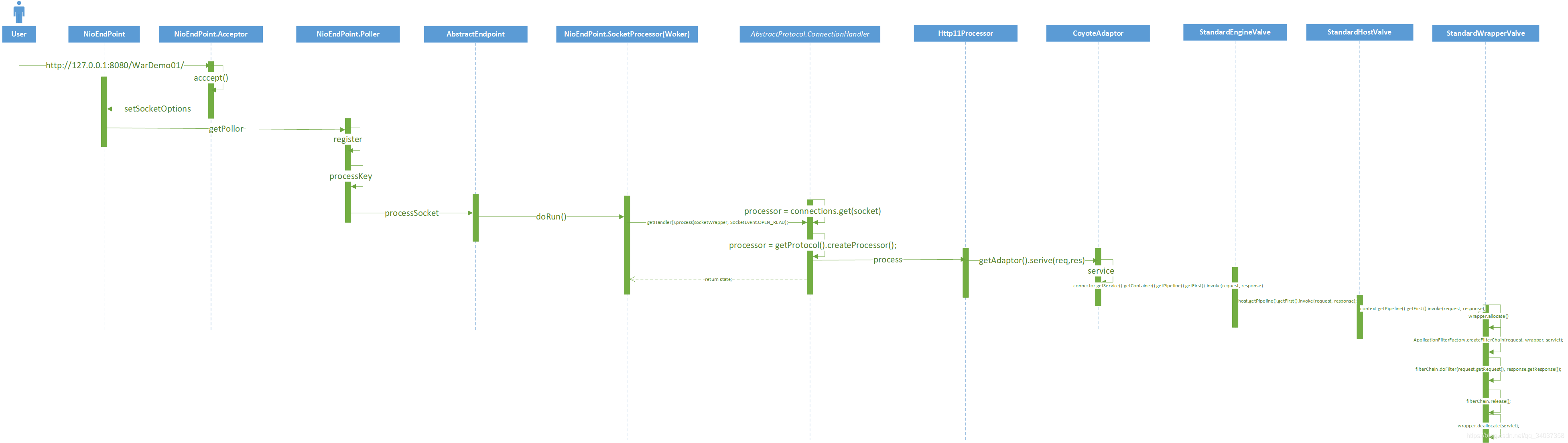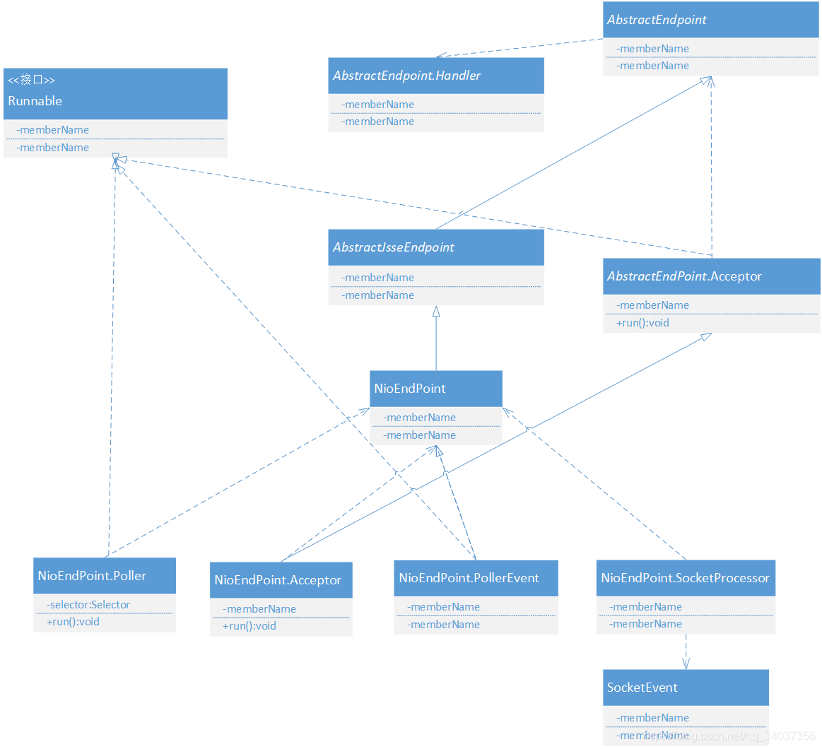 默認(rèn)的EndPoint實(shí)現(xiàn)是NioEndPoint,NioEndPoint有四個(gè)內(nèi)部類,分別是Poller、Acceptor、PollerEvent、SocketProcessor、NioSocketWrapper。